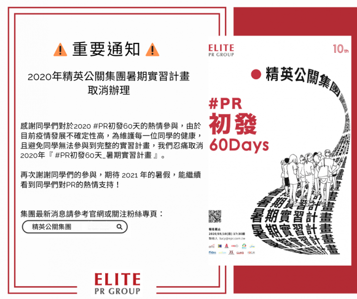我們決定忍痛取消辦理2020年『 #PR初發60天_暑期實習計畫 』。